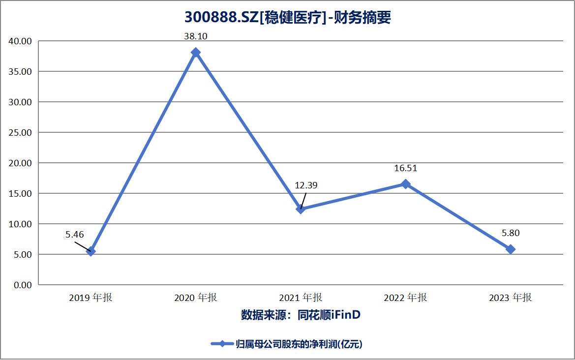 总体来看,稳健医疗近五年的归母净利润情况似乎并不“稳健”。2019-2023年,稳健医疗的归母净利润分别为5.46亿元、38.10亿元、12.39亿元、16.51亿元和5.80亿元。