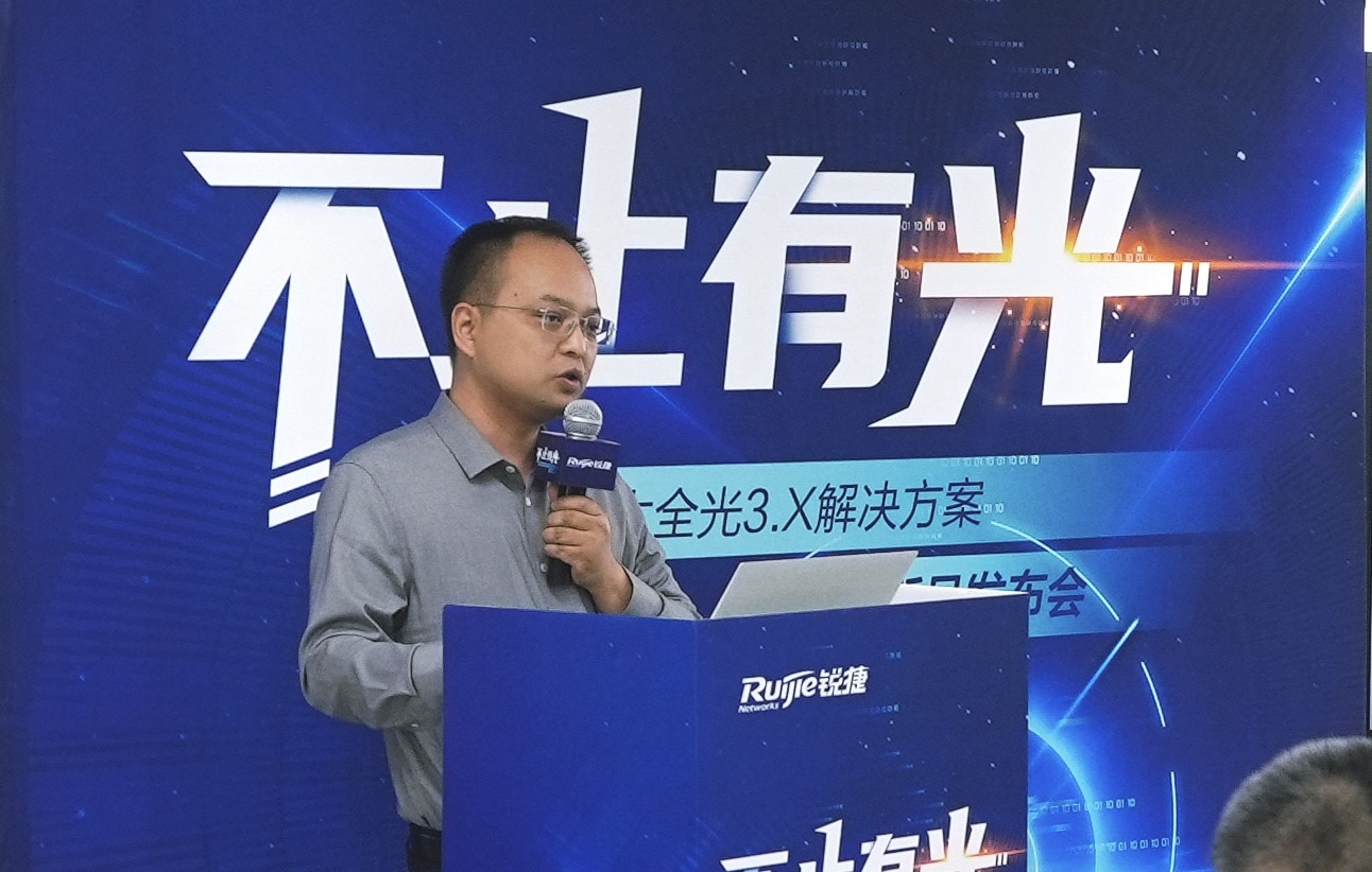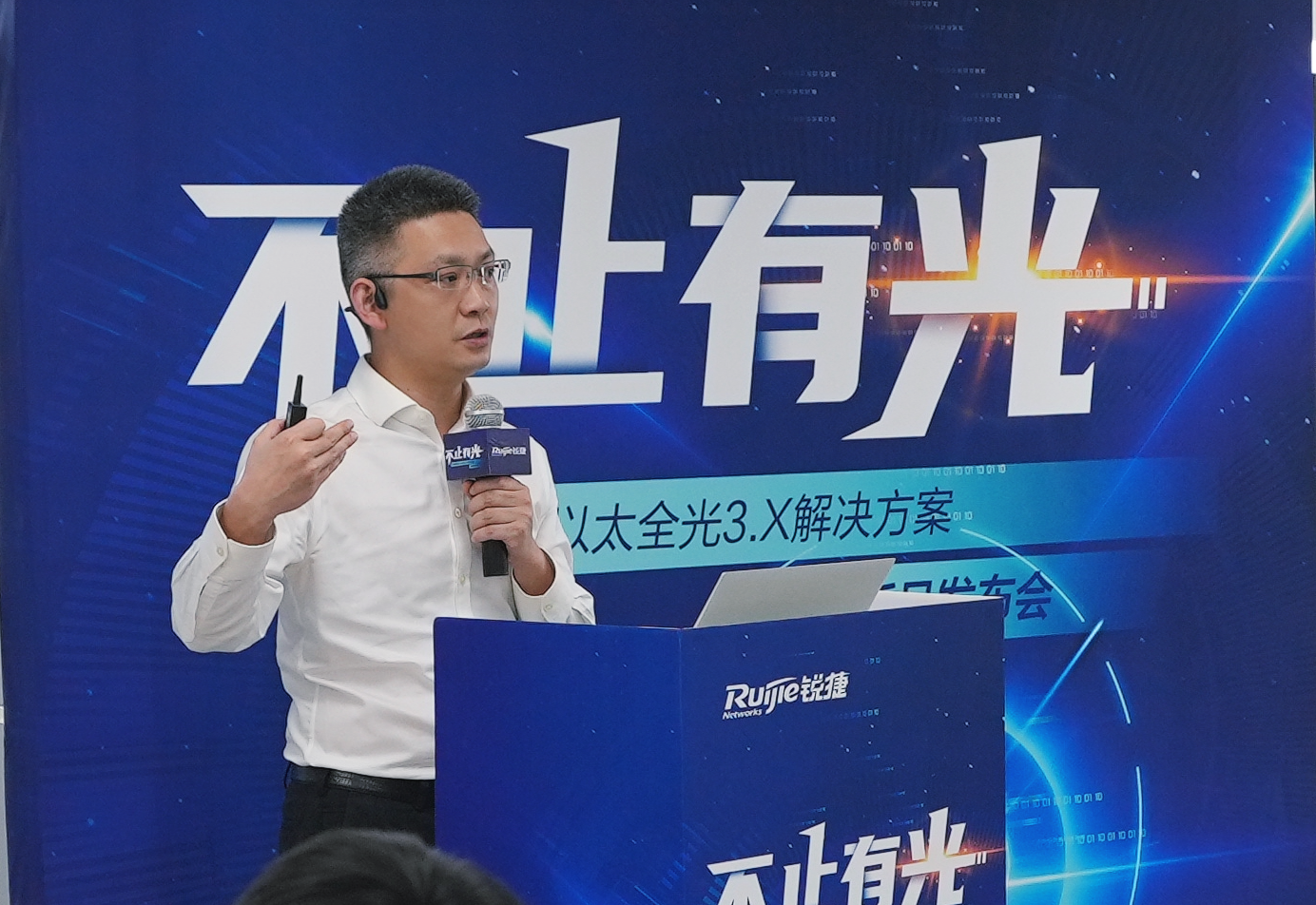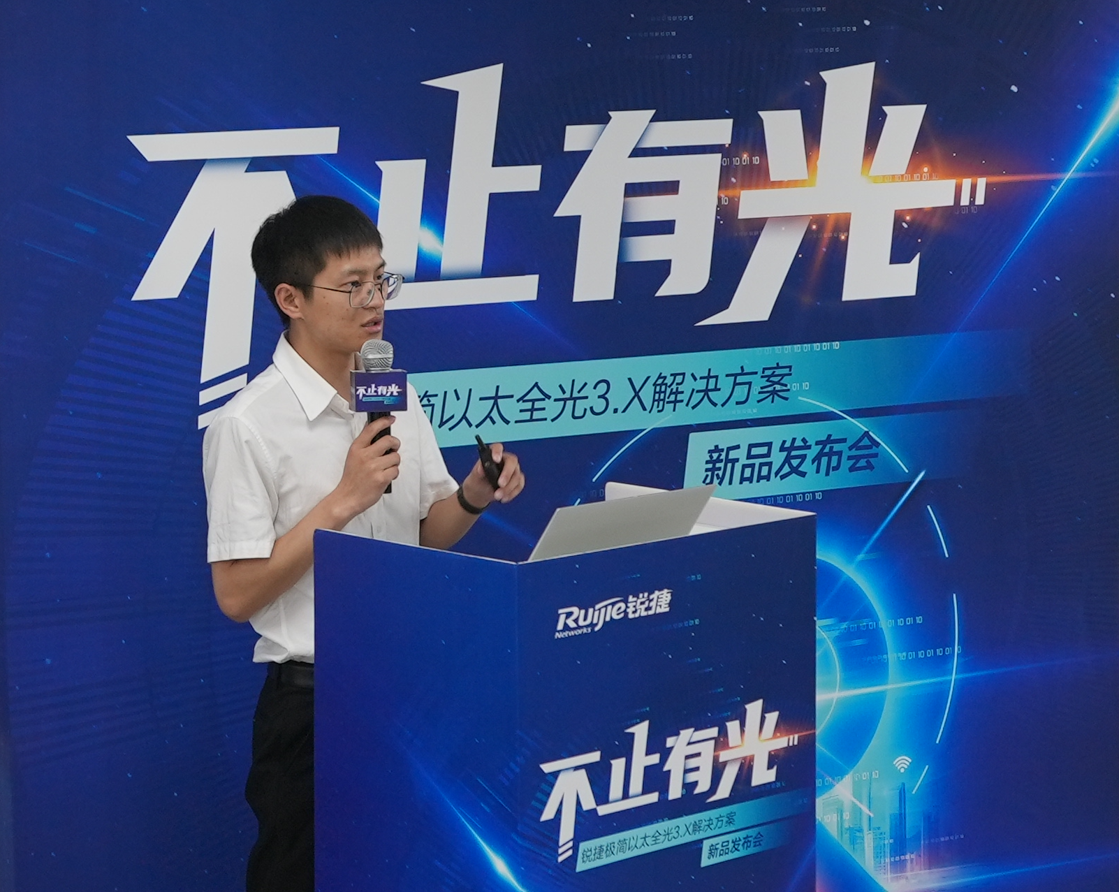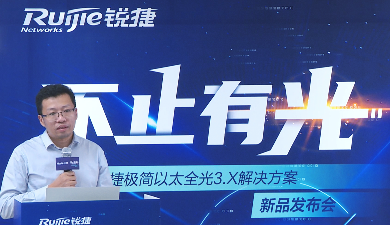 锐捷网络无线交换产品事业部极简光方案产品总监马文强在发布会现场为大家正式发布了极简以太全光3.X解决方案。全新的极简光3.X,同时支持光改、光混、彩光三种架构,具备网络易扩展、长距离部署、真万兆入室等优势,适配不同行业的网络部署场景;前瞻性在园区引入以太彩光技术,在有效降低中心机房到各楼栋之间的布线成本,确保带宽独享的基础上,实现接入层集中供电,既可采用彩光集中供电技术实现弱电间无源,强电间集中供电,又可通过光电分离式恒星主机搭配光电混合缆实现长距离光纤传输与PoE供电,解除用户数字化转型的后顾之忧。