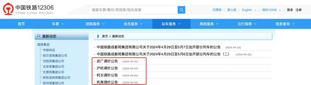 中国铁路12306官网日前发布了四则调价公告。公告指出,为进一步提升高铁运营品质、满足旅客不同出行需求,决定自2024年6月15日起,对京广高铁武广段、沪昆高铁沪杭段、沪昆高铁杭长段、杭深铁路杭甬段上运行的时速300公里及以上动车组列车公布票价进行优化调整,并根据市场状况,区分季节、日期、时段、席别等因素,建立灵活定价机制,实行有升有降、差异化的折扣浮动策略。