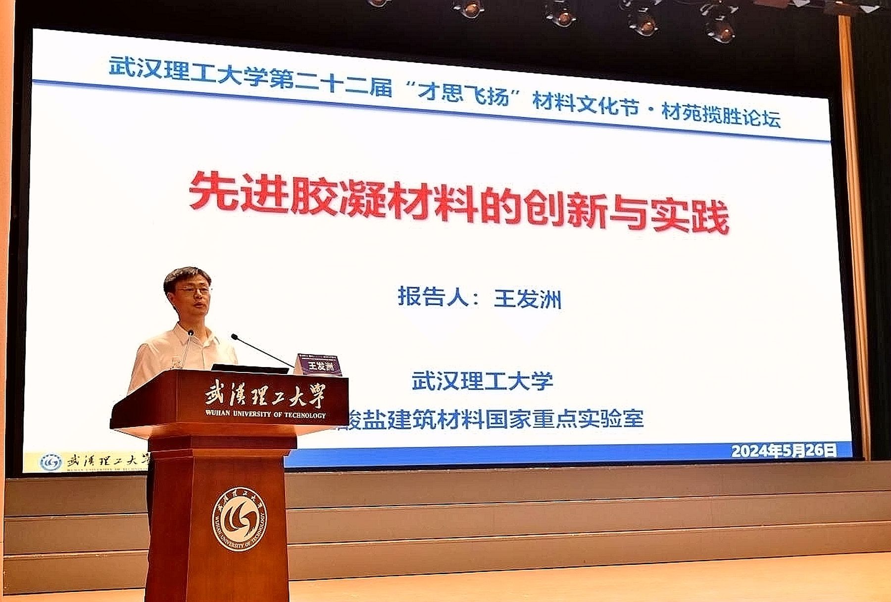 开幕式结束后,武汉理工大学副校长王发洲教授以“先进胶凝材料的创新与实践”为题作学术报告。他回溯材料发展史,引出胶凝材料的科学基础和实际应用,并介绍学校碳矿化材料研究的历史与前沿。在互动环节,王发洲回答了同学们的积极提问,并就碳矿化材料相较于其他碳减排技术的优势和特点、胶凝材料的发展现状和实际应用、纤维和水泥的结合方法和常温下陶瓷的致密化等问题展开详细阐述。他鼓励同学们保持勇于创新,大胆实践的科研精神,为科技自立自强与祖国的繁荣发展贡献自己的力量。(阎友华 黄天佑 徐佳伟)
