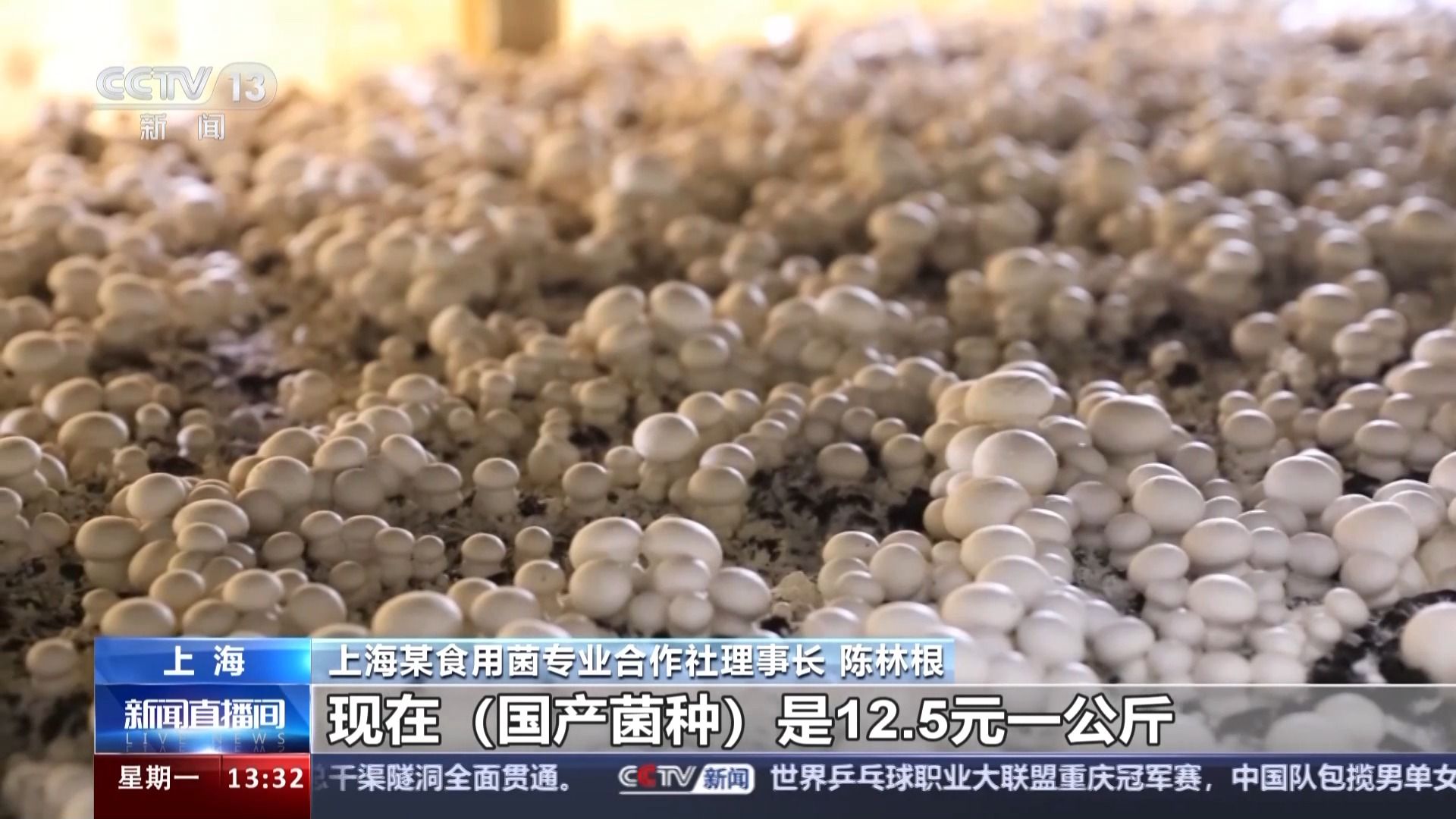 上海某食用菌专业合作社理事长陈林根:进口种子现在到我们这里是要21.5元一公斤,现在国产菌种是12.5元一公斤,一年要省下四五百万成本。