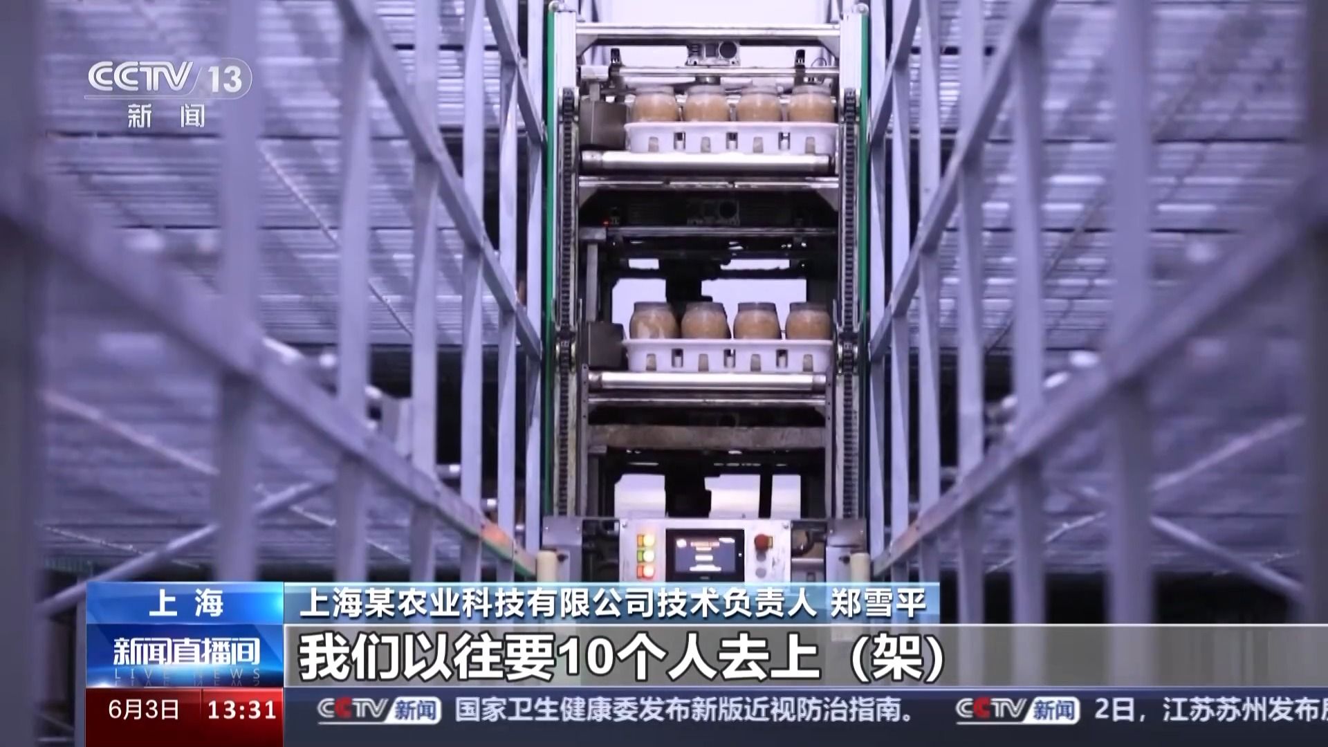 上海某农业科技有限公司技术负责人郑雪平:每一间菇房要上架4万多瓶菌瓶,那就是两千多筐,我们以往要10个人去上架,要上到7米高的高度,那实际上工作的危险程度也很大,劳动力强度也很大。现在,4万多瓶一个人四个小时就完成了整个上架过程。