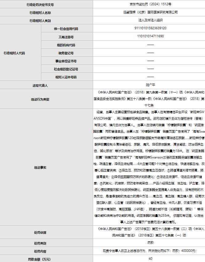 北京市东城区市场监督管理局认为,远鉴恒辉违反了《中华人民共和国广告法》(2018)第九条第一款第(十一)项;《中华人民共和国食品安全法实施条例》第三十八条第一款;《中华人民共和国广告法》(2018)第十七条,现责令远鉴恒辉改正上述违法行为,并决定罚款40万元。