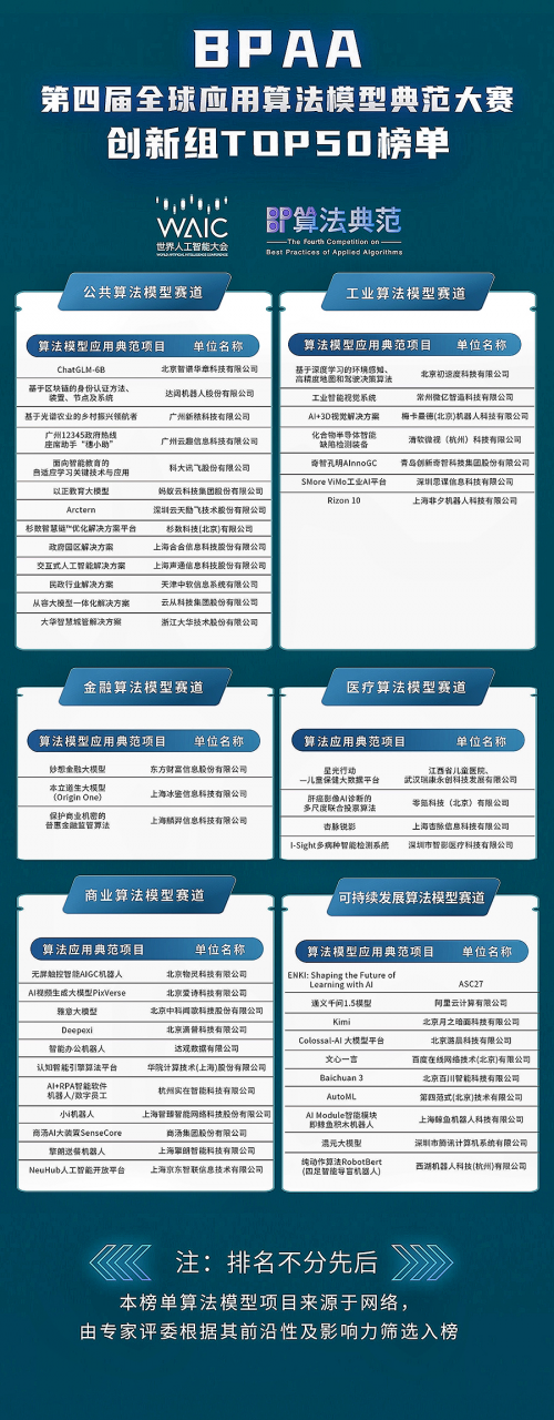 附图第四届全球应用算法模型典范大赛创新组TOP50榜单