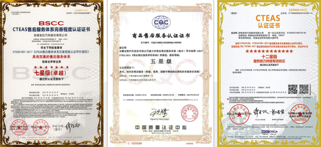 凭借其卓越的服务品质,安凯客车屡获殊荣,包括中国质量认证中心(CQC)的“五星级”售后服务认证、CTEAS售后服务体系的“七星级(卓越)”认证、中国汽车售后服务客户满意度调查的“客车品牌第一名”,以及CTEAS的“十二星级(服务能力持续有效验证)”认证等,安凯客车一次次用实力铸就口碑,以实力彰显品质。