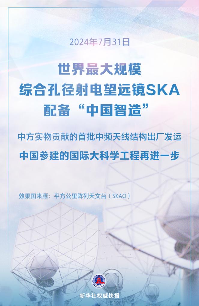 7月31日,中方向国际组织平方公里阵列天文台(SKAO)实物贡献的首批平方公里阵列射电望远镜(SKA)中频天线结构在河北石家庄完成出厂验收,启程运往位于南非的SKA中频天线台址。这标志着中国在参与建设SKA的道路上又迈出了坚实一步。