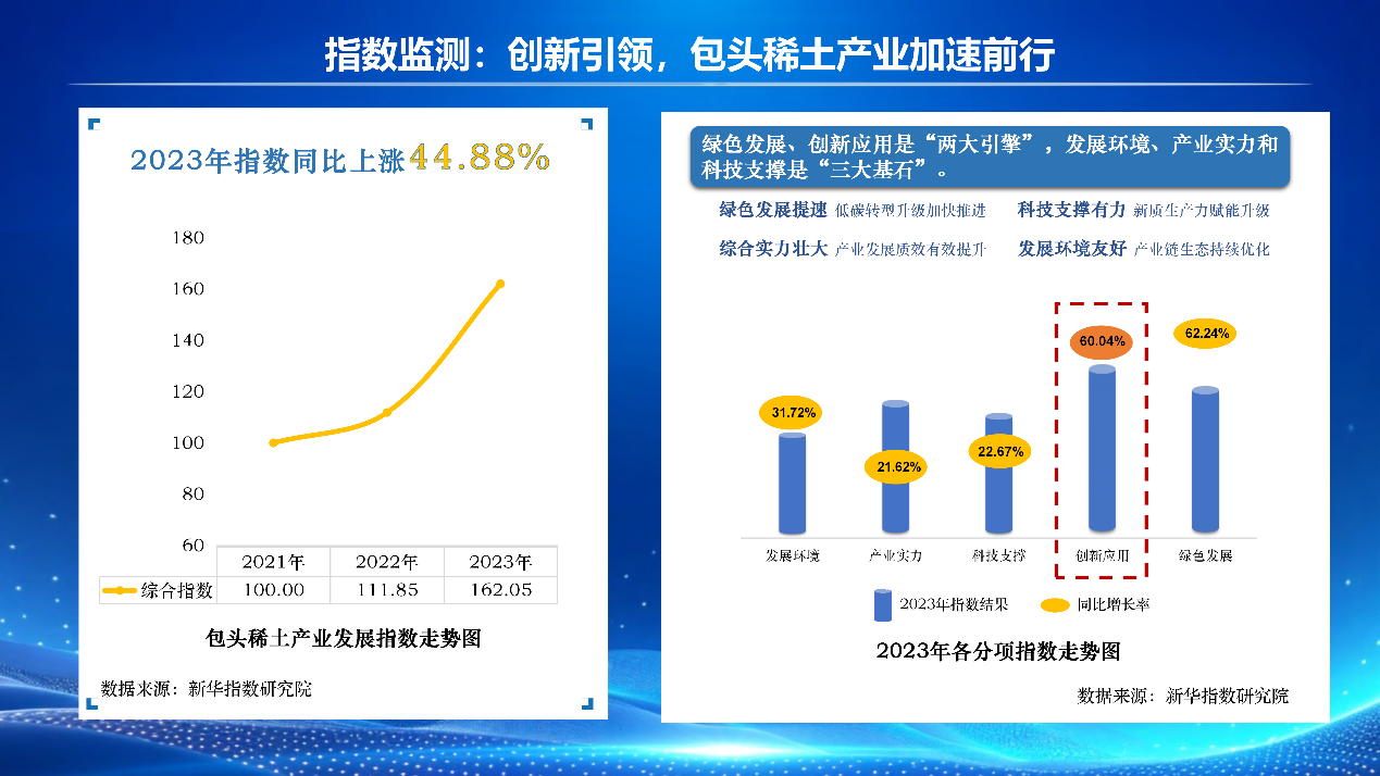 包头稀土产业发展指数显示,近年来,包头稀土产业加速发展,2023年指数为162.05点,同比上涨44.88%。五个分项指标均呈明显上涨态势,其中,绿色发展、创新应用“两驾马车”驱动有力,发展环境、产业实力和科技支撑“三大基石”坚实牢固,展现了包头在中国稀土产业高质量发展中的“旗舰力量”。