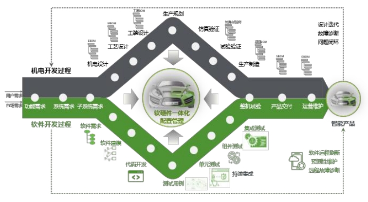 首先,软件开发模式与硬件开发模式截然不同。软件开发过程大致可分为需求定义,系统设计,代码开发,单元测试,集成测试和部署运维等。由于软件本身的特殊性,软件开发过程更易实现上述过程的信息化,因此早在20世纪八九十年代就已经涌现出一大批成熟的软件建模、开发和测试工具。为提升软件开发运维协作效率,缩短软件研发周期,提高软件质量,制造商开始引入在软件工程领域备受推崇的敏捷开发和基于DevOps的持续集成部署方法。。在数字化时代,敏捷和DevOps等开发部署模式已经被广泛接纳,被认为是“软件定义产品”型企业数字化转型致胜的关键。然而,对于制造企业而言,其产品包含了软件和硬件,需要两者协同开发完成。相比硬件开发过程,软件开发迭代速度更快,周期更短,当硬件完成一个迭代周期时,软件可能已经演进了几个乃至十几个迭代。怎样保证软硬件既同步又保持各自的迭代速度,同时又能保证软硬件一体化产品配置,成为大部份企业面临的挑战。