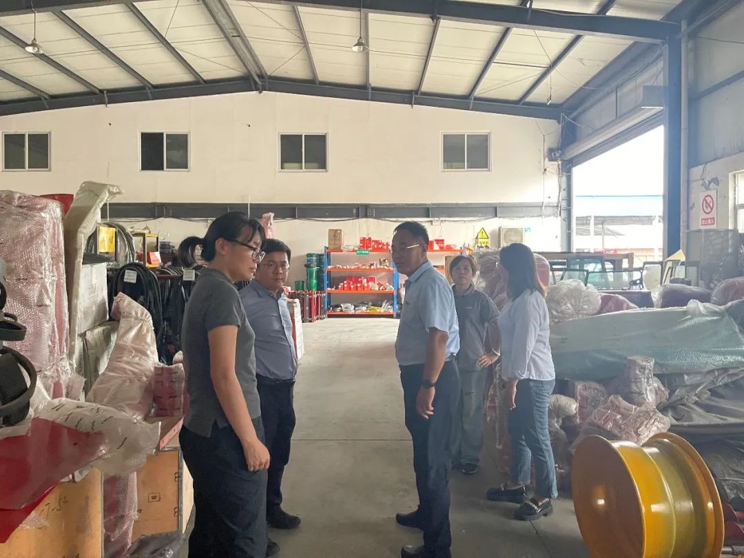 姬有信(左三)向大家介绍公司服务中心设施设备、配件储备及服务人员等情况