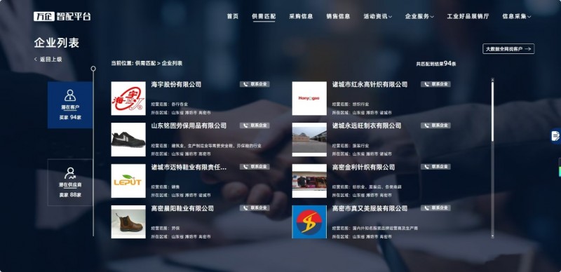 潍坊市“万企智配平台”是由潍坊市工业和信息化局结合全市工业制造业企业的市场需求、采购需求和服务需求,搭建的多样化为一体的供需对接服务平台。平台以服务各企业用户、为企业用户提供供需匹配、降本增效、促进经济增长为服务原则,通过梳理潍坊市28条优势产业链,建立企业上下游关系,利用智能匹配算力模型,自动匹配潜在客户和原材料供应商,帮助企业实现登录即匹配、上线即查看,快速实现本地互配互采,为企业提供精准的合作机会。