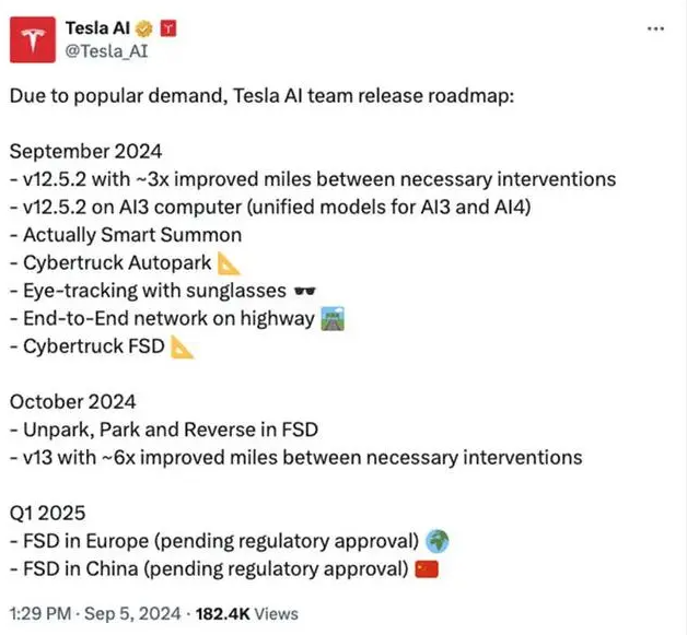 9月5日,特斯拉(TSLA.O)人工智能(AI)团队发布产品路线图,预计2025年第一季度在中国和欧洲推出完全自动驾驶(FSD),但有待于监管批准。