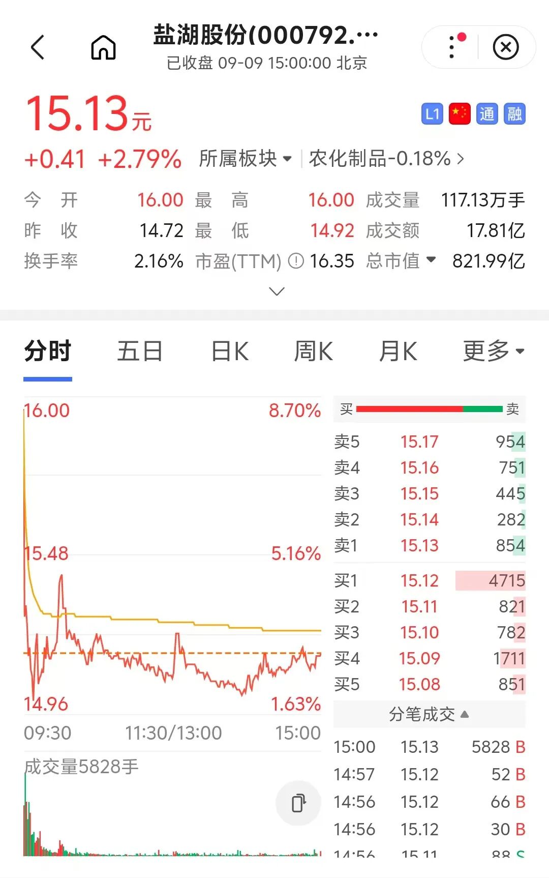 若上述交易完成后,盐湖股份将成为中国五矿旗下第9家上市公司。据悉,盐湖股份被称为盐湖锂资源第一股,截至9月9日收盘的总市值为821.99亿元。