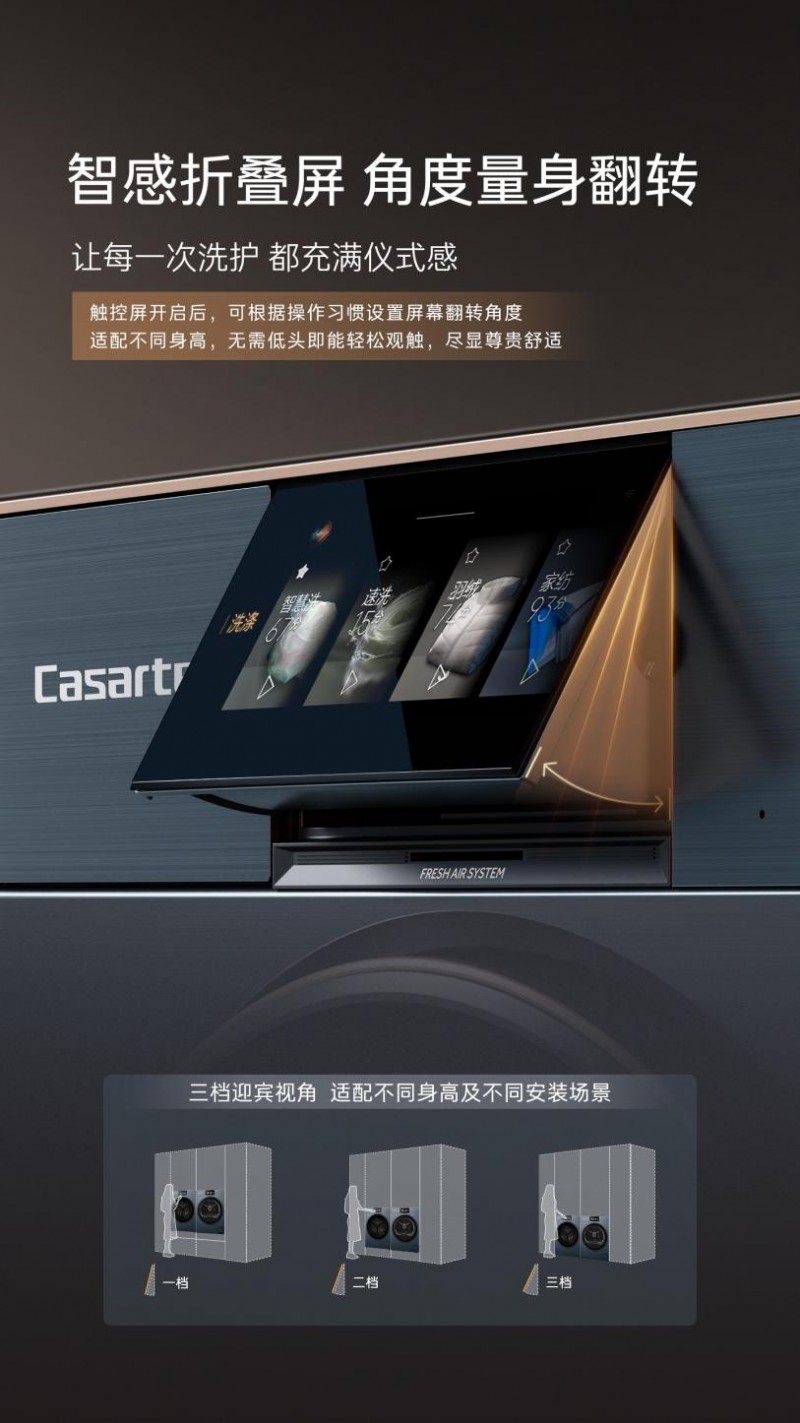 在操作体验上,卡萨帝指挥家洗烘套装还首创了三档迎宾视角的操作屏,即“智感迎宾折叠屏”能根据安装空间和用户的使用习惯调节档位,让用户无需低头弯腰就能轻松操作。并且云脑智慧管家可以为用户提供海量洗护方案,让每一次洗护都充满仪式感和智慧体验感。