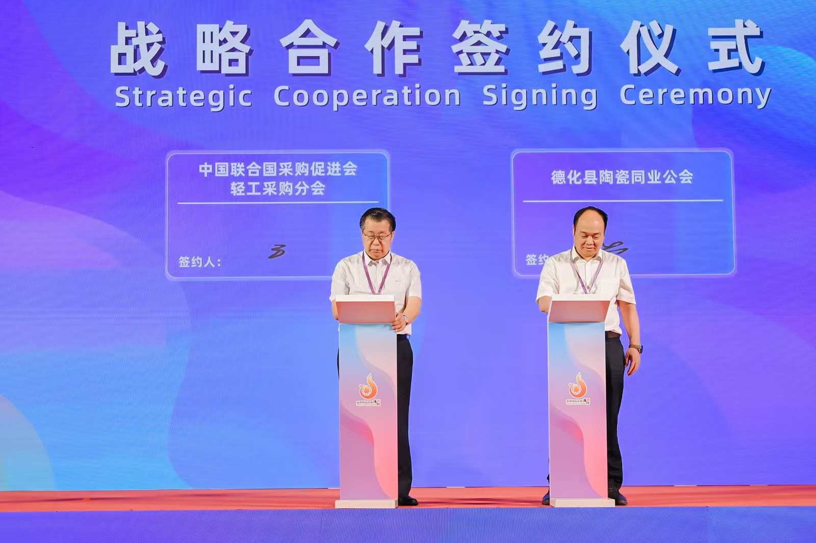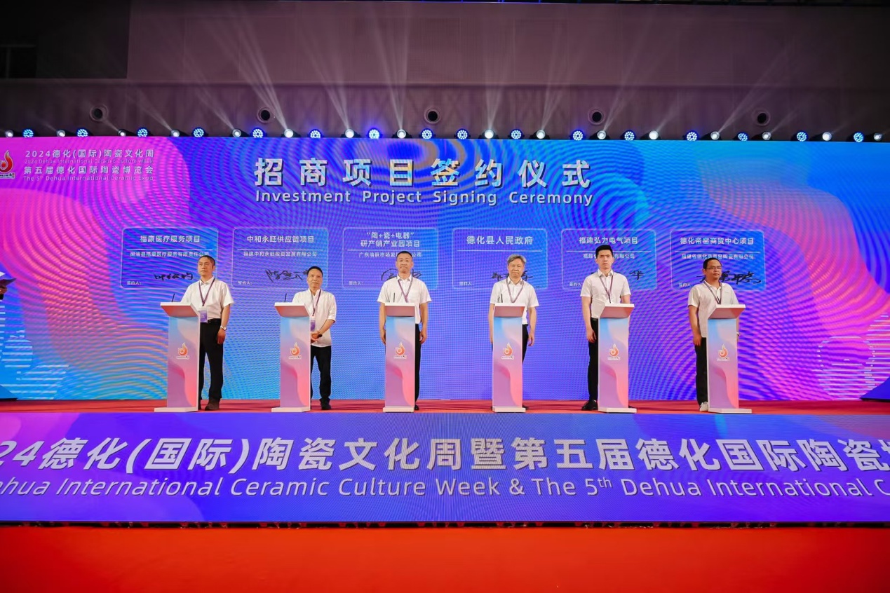 开幕式上,同时发布了《日用陶瓷生产企业循环利用评估导则》《传统雕塑瓷制作技艺》两项省地方标准,启动了“中国白•德化瓷”全国设计大师奖,颁发了第八届“何朝宗杯”中国(德化)陶瓷工业设计大赛金奖和特等奖,并举行了一系列签约仪式,包括中国联合国采购促进会轻工采购分会与德化县陶瓷同业公会战略合作签约和招商项目签约。10个签约项目,协议总投资59.1亿元,涵盖半导体制热、光伏发电、医疗康养、商业综合体、高端陶瓷生产及供应链建设等多个领域,既有现代科技的创新应用,也有传统支柱产业的改造升级,旨在加快发展新质生产力,增强陶瓷产业发展新动能。