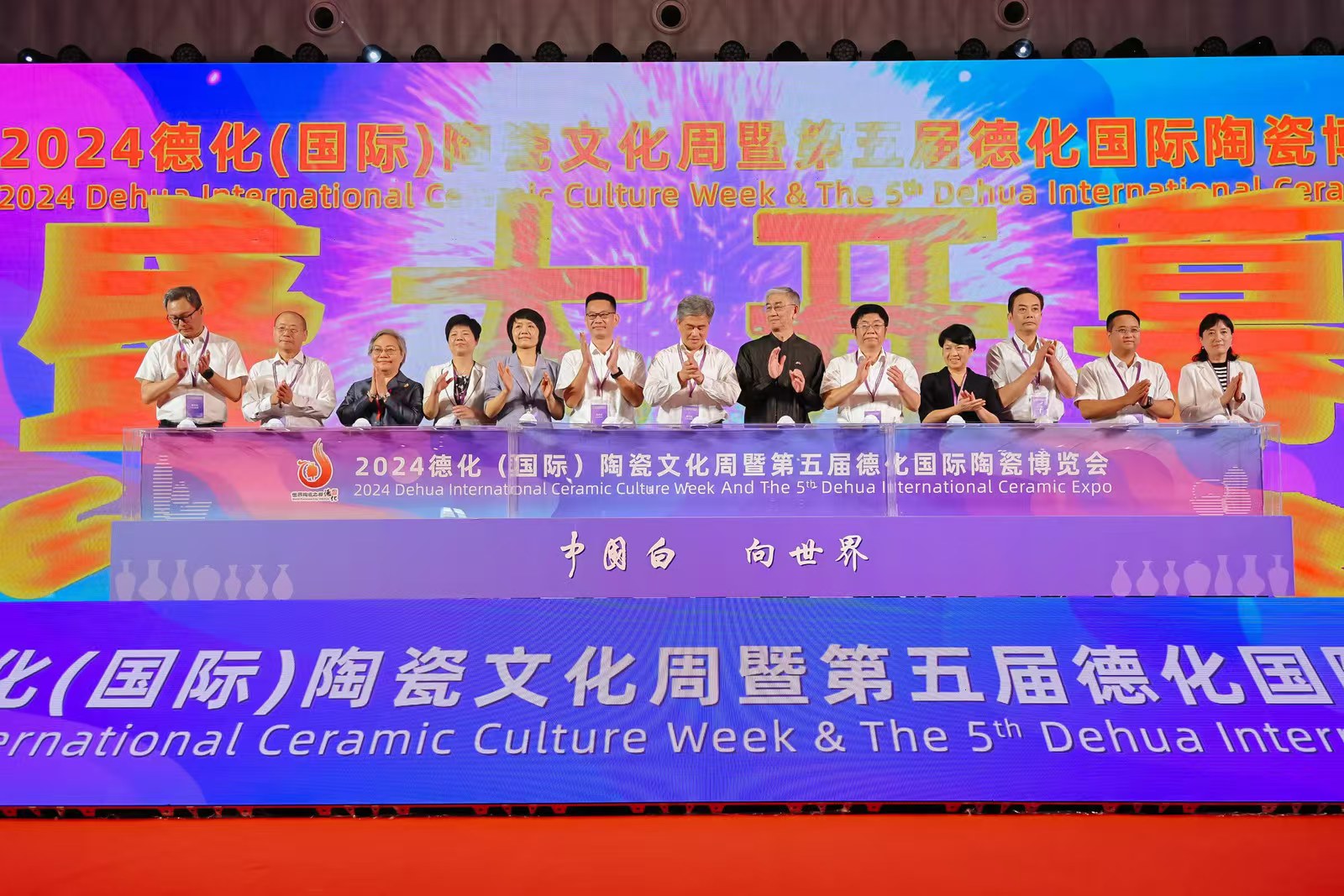 9月19日,以“中国白•向世界”为主题的2024德化(国际)陶瓷文化周暨第五届德化国际陶瓷博览会(简称“德化陶瓷周”)在福建德化县隆重举行。全国政协常委、福建省政协副主席、民盟中央常委、福建省委会主委阮诗玮;中国前驻法国特命全权大使、第十一届全国政协外事委员会副主任、外交学院原院长赵进军,泉州市人民政府副市长黄文捷,中国陶瓷工业协会副理事长兼秘书长侯文全,中国工艺美术学会驻会副理事长任建新,泰国、菲律宾等驻华使领馆使节、国际友人,福建省工信厅、商务厅、市场监管局、妇联等有关单位领导,来自全国其他陶瓷产区、高校及科研机构、行业协会及商会、参展商、采购商代表以及媒体记者等600多人出席了开幕式。