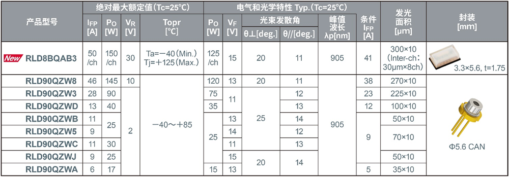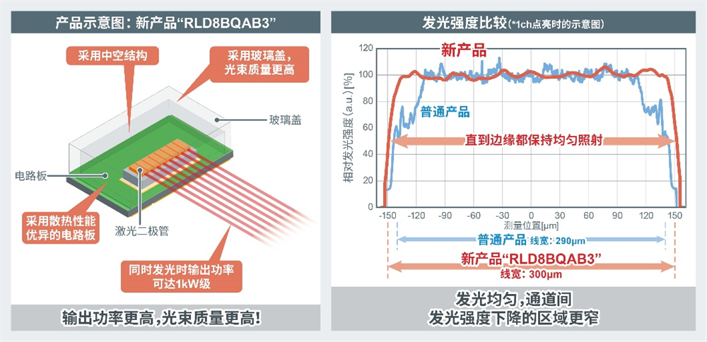 近年来,除了车载ADAS领域外,在AGV、无人机和扫地机器人等需要自动化工作的广泛应用中,可以准确测量距离和识别空间的LiDAR日益普及。在这种背景下,为了“更远”、“更准确”地检测到信息,对于作为光源的激光二极管有“希望产生千瓦级的高输出功率”、“希望多个光源以很短的间隔发光”等需求。ROHM已经拥有可实现更窄激光线宽的自有专利技术,有助于LiDAR支持更远的距离并实现更高的精度。2019年,ROHM推出了输出功率25W的“RLD90QZW5”;2023年,又开发出输出功率高达120W的激光二极管“RLD90QZW8”。此次,利用该技术,ROHM又开发出125W、8ch(1kW级)阵列型新产品,满足了市场对高输出功率和高性能激光二极管的需求。