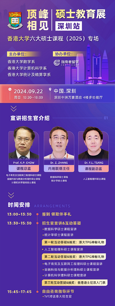 2024年9月,由香港大学主办指南者留学协办的“顶峰相见”硕士教育展深圳站成功举办。展会汇聚香港大学统计及精算学系、计算机科学系、数学系:数据科学硕士、统计学硕士、人工智能理学硕士、计算机科学理科硕士、金融科技与数据分析理科硕士、电子商贸及互联网工程理科硕士六大硕士课程亮相此次展会。