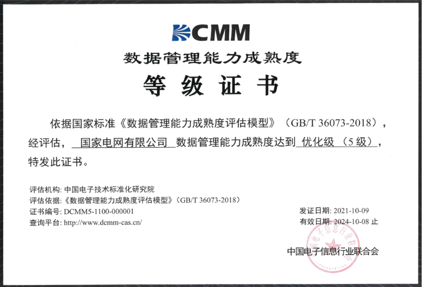 数据制度标准,以《国家电网有限公司数据管理办法》为引领,构建涵盖数据标准、数据质量、数据共享、数据安全等职能域的管理细则和指导意见。建立覆盖基础、数据、技术方法、平台与工具、管理、安全与隐私、服务与应用等7大类、23个方面、39个方向的数据标准体系框架,优化数据标准管理规范和流程,实现数据标准从制定到优化提升全过程管理。依托《数据管理能力成熟度评估模型》(DCMM)国家标准,结合电网数据管理实际情况,制定《国家电网有限公司数据管理能力成熟度模型》(SG-DCMM)企业标准,创新提出100项数据管理要素,建立能力等级标准与数据管理体系有效映射,2021年获评全国首家DCMM五级(优化级)认证单位。