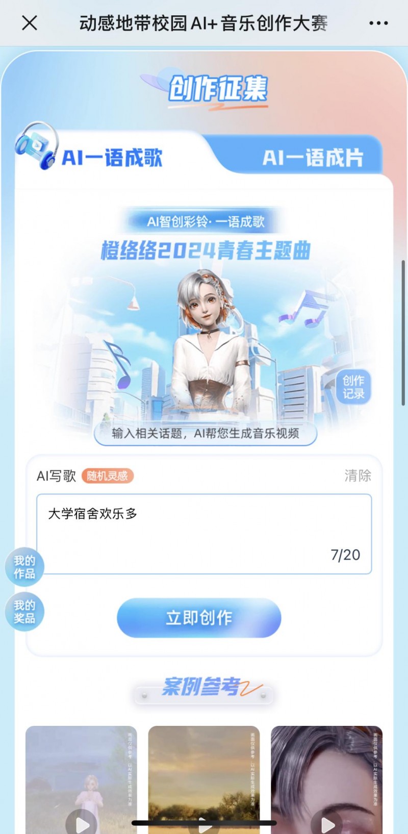 登录咪咕音乐APP,线上赛火热进行中,“AI一语成歌”“AI一语成片”两大创作工具加成,大学生们的AI创作才华疯狂输出。“AI一语成歌”是国内首款文生音乐视频彩铃应用,可以智能完成词、曲、编、唱、录、混全链路音乐创作,输入一句文案如“大学宿舍欢乐多”,就能得到一支欢乐指数满满、洋溢青春气息的的原创AIGC音乐视频,设为视频彩铃就能给同学们秀一段AI花式整活,E人人设拿捏!
