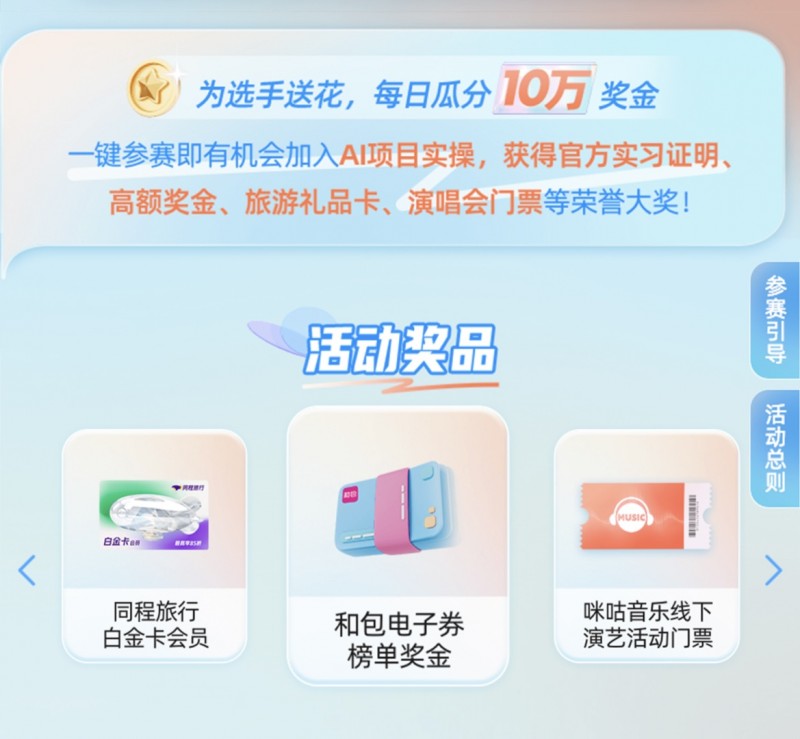 本次大赛还为大学生们准备了AI赛道上的“第一桶金”,不仅参赛者有机会赢2000元奖金、同程旅行会员&千元礼品卡和线下演艺活动门票等好礼,同学、亲友团们每日为选手送花还可共享10万元奖金。针对大赛产生的15位优胜者,中国移动咪咕还将携手AIGC大厂和科技公司提供相关岗位实习机会,为未来求职就业再加一份技能点!