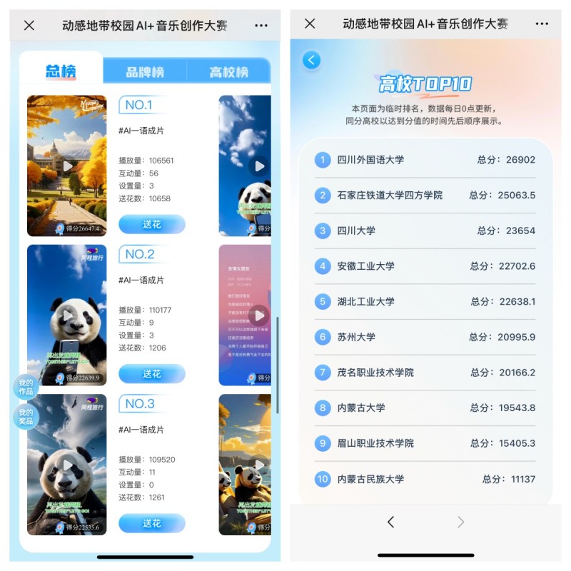 随着大赛进程的白热化,作品榜单涌现出了诸多才华玩家和出色作品,人气作品播放量均突破10万+。大赛围绕“橙络络2024青春主题曲”“动感地带的迎新舞台”“带着熊猫去旅行”三大投稿主题,设有“总榜”“品牌榜”“高校榜”三大榜单,参赛者除了秀个人才华还能为所在学校而战,和同校AI玩家一起争夺集体荣誉。