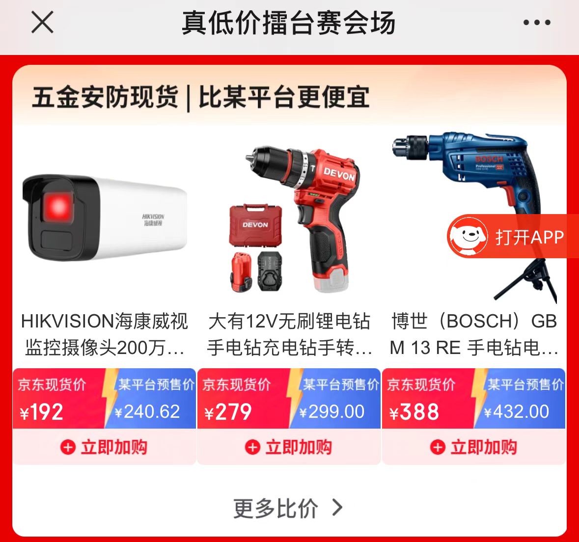 以五金安防产品为例,海康威视监控摄像头某平台预售价为240元,京东现货价仅为192元,便宜48元;博世手电钻某平台预售价为432元,京东现货价仅为388元,便宜44元;大有12V无刷锂电钻某平台预售价为299元,京东现货价仅为279元,便宜20元。