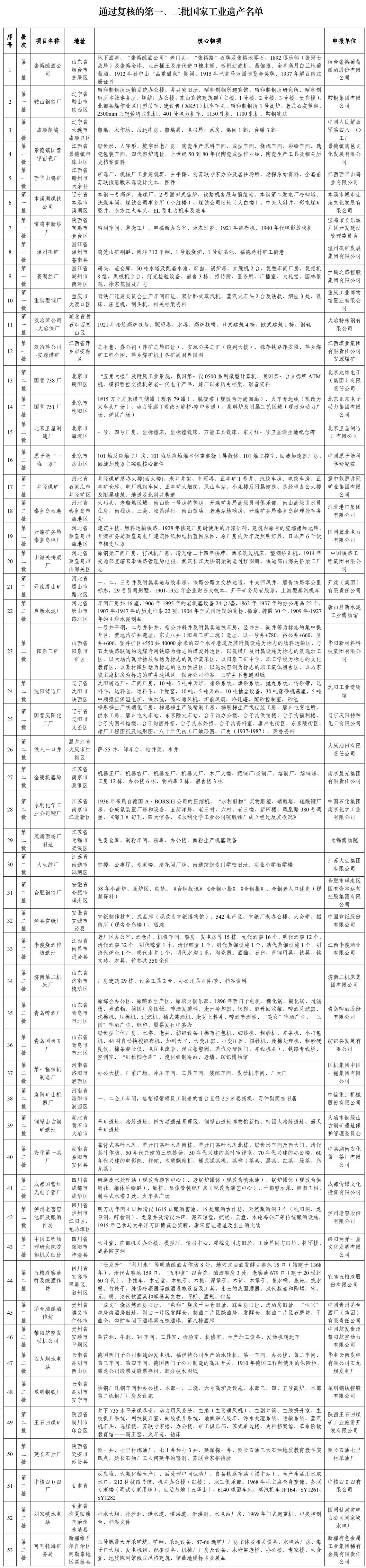2.通过复核的第一、二批国家工业遗产名单