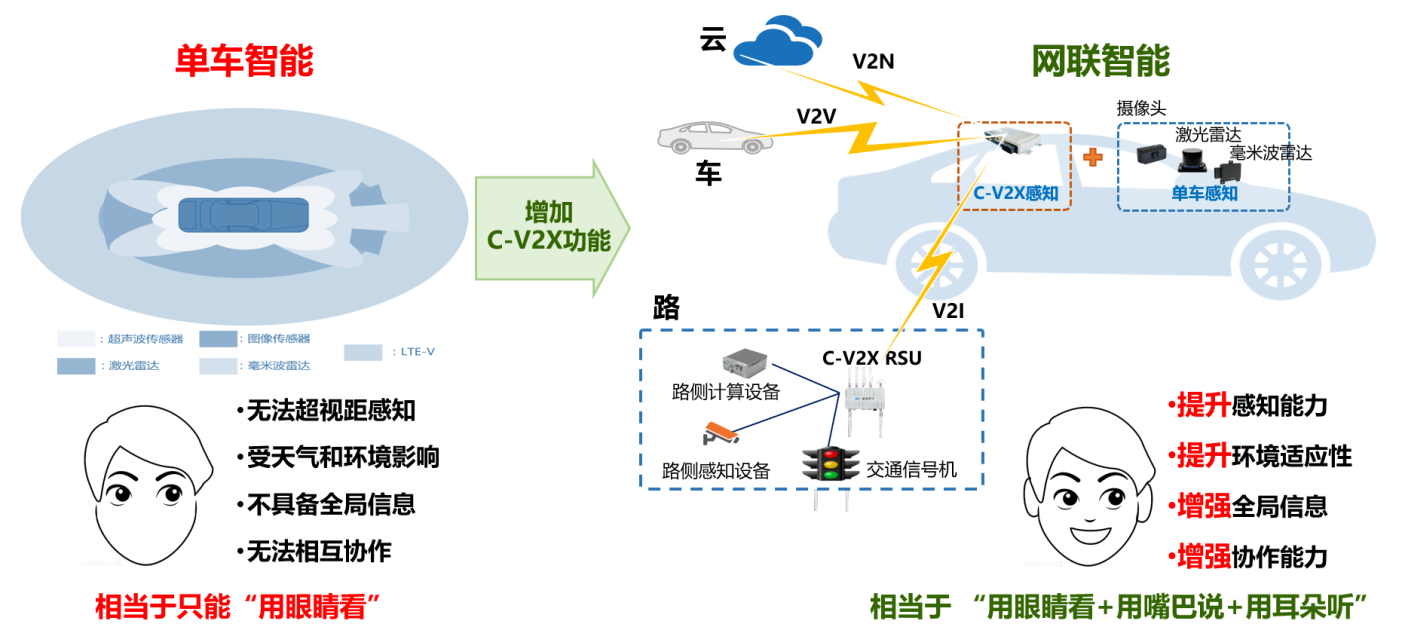 基于单车智能,增加C-V2X功能实现网联智能,可有效突破无法超视距感知、受天气和环境影响、不具备全局信息、无法相互协作难题,提升感知能力、环境适应性,增强全局信息和协作能力。
