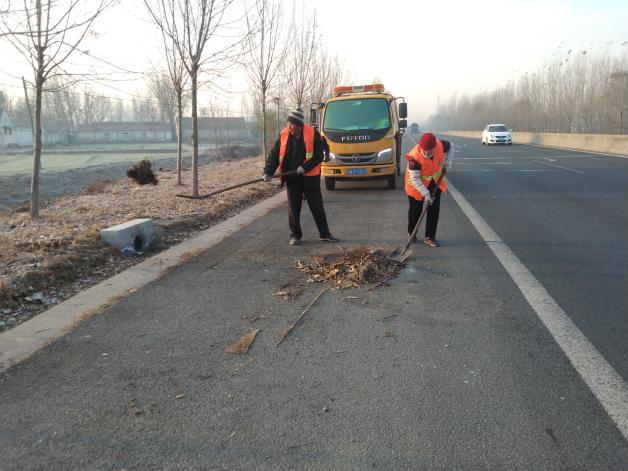 该单位坚持高标准、严要求、快行动,对路肩杂草、垃圾做好清除,清扫辅路漏撒、堆积的沙尘、白灰等废弃物,防止大风引起路面扬尘现象,出动机械,沿辖区道路全线清扫,提高工作效率,保护道路环境。