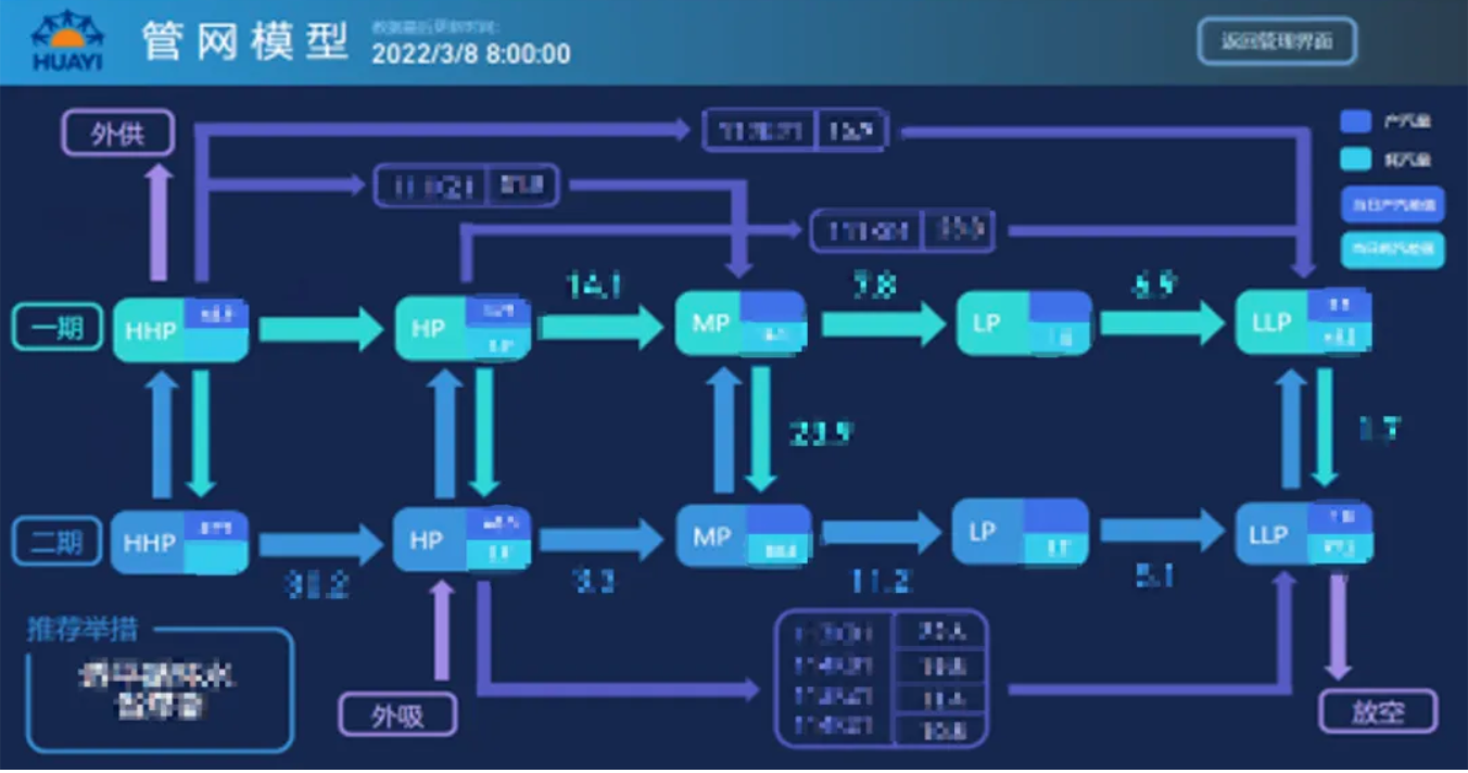 华谊新材料通过大数据历史工况寻优,利用历史数据预测能效变化,并结合Simplex算法(单纯形算法)寻优经济性最大的蒸汽网络平衡举措方案,指导一线人员在不同工况下,配合减温减压阀、省煤器、循环水透平、乏汽回收设备的使用,从64个可能的操作组合中选择最优操作组合,提高管网平衡能力,减少无效蒸汽放空,优化蒸汽管网调度能力。