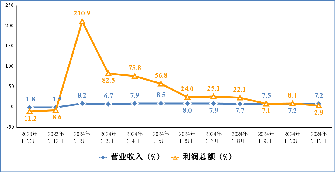 1—11月份,规模以上电子信息制造业实现营业收入14.45万亿元,同比增长7.2%;营业成本12.65万亿元,同比增长7.3%;实现利润总额5653亿元,同比增长2.9%;营业收入利润率为3.9%,较1—10月份回落0.1个百分点。11月份,规模以上电子信息制造业营业收入1.49万亿元,同比增长7.2%。