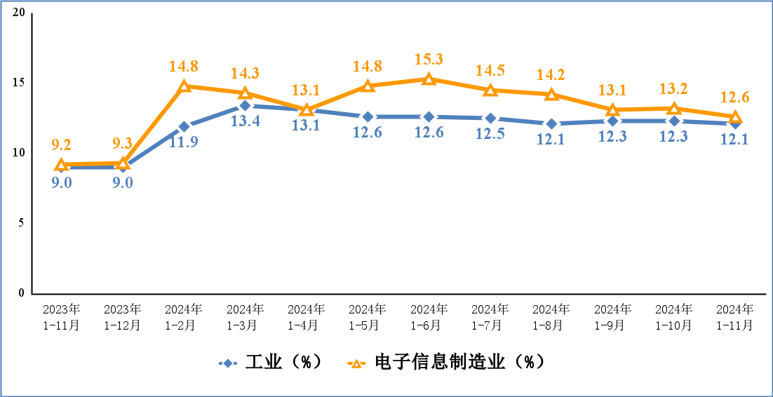 1—11月份,电子信息制造业固定资产投资同比增长12.6%,较1—10月份回落0.6个百分点,比同期工业、高技术制造业投资增速分别高0.5个和4.4个百分点。