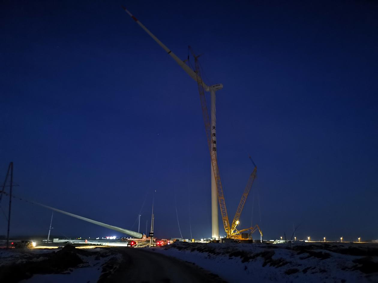 2025年1月10日,大庆油田工程建设公司资源共享中心在林甸60万千瓦风光发电项目中,成功完成首台6.25MW风机的整体吊装,该项目总装机量50万千瓦,共有80台6.25兆瓦风机,是大庆油田落实国家绿色能源发展政策,实现绿色低碳转型发展的标志性工程。