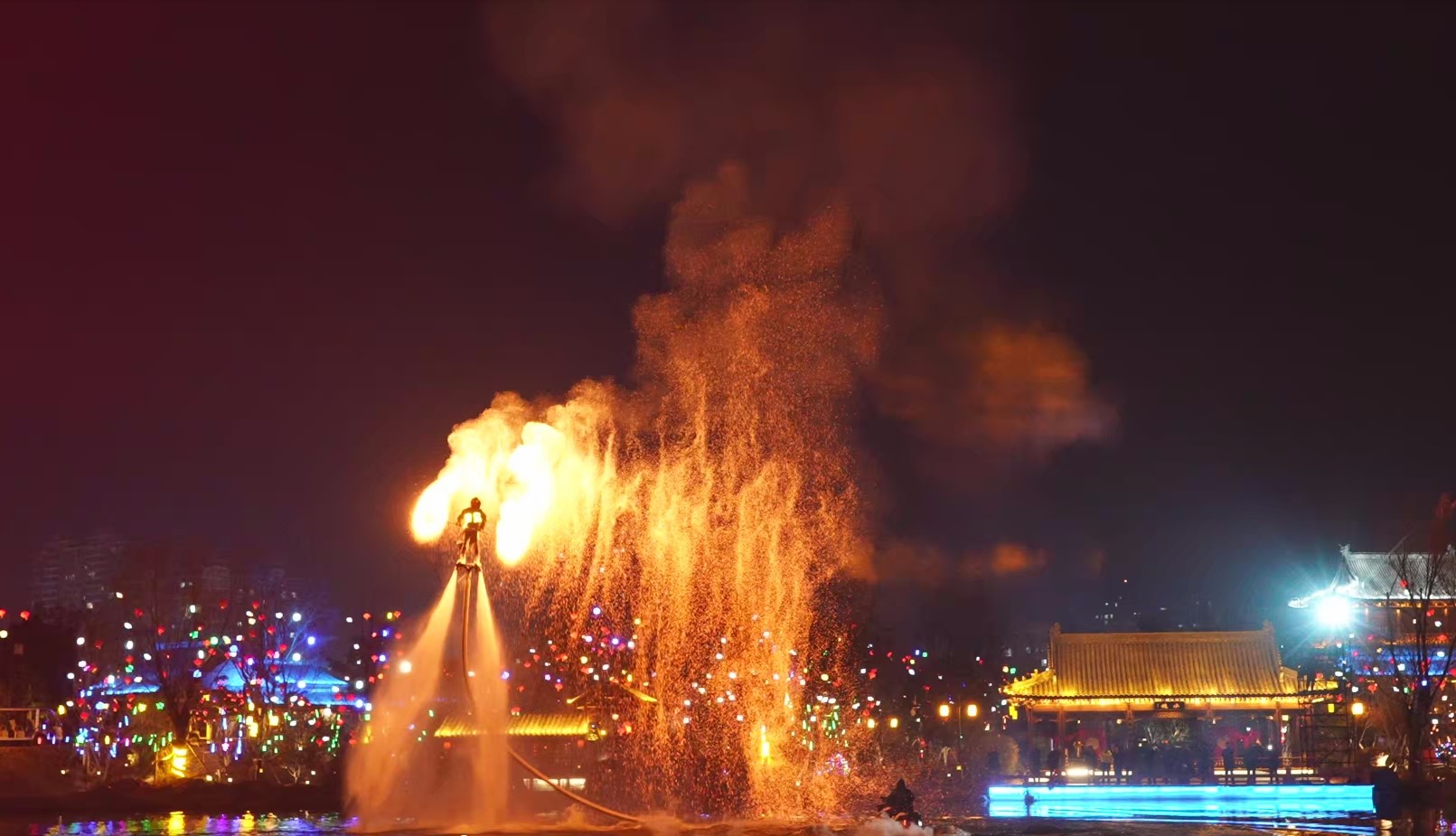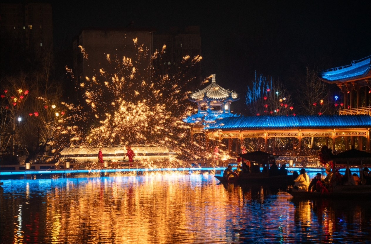 夜幕降临,庙会呈现出另一番迷人景象。南阳三顾广场的灯光秀《梦回三国》,将绚丽灯光与三国元素巧妙融合,打造出如梦如幻的视觉盛宴;天下第一岗亢龙潭的水幕光影秀《龙腾天下》,水幕与光影相互交织,配合震撼的音乐与特效,一条巨龙在水幕中腾飞而起,场面震撼人心;夜场重磅节目“微春晚”《只有南阳》,节目涵盖精彩的打铁花、水上火壶、火魔方等多个非遗绝技,“姜子牙”携“众仙归位”、“四圣”穿越,讲述南阳的传奇故事;三顾茶舍的非遗表演皮影戏,则让游客近距离领略到传统民间艺术的独特韵味。