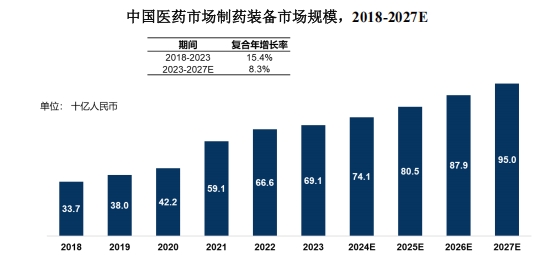近年来,随着我国医药行业的快速发展,制药装备市场需求持续增长。2018年至2023年,中国制药装备市场规模从337亿元增长至691亿元,复合年增长率达15.4%。预计到2027年,市场规模将进一步扩大至950亿元。与此同时,国家“医保控费”、“仿制药一致性评价”和“药品带量采购”等政策的实施,对制药企业的成本控制和质量标准提出了更高要求,推动了国产制药装备的替代需求。