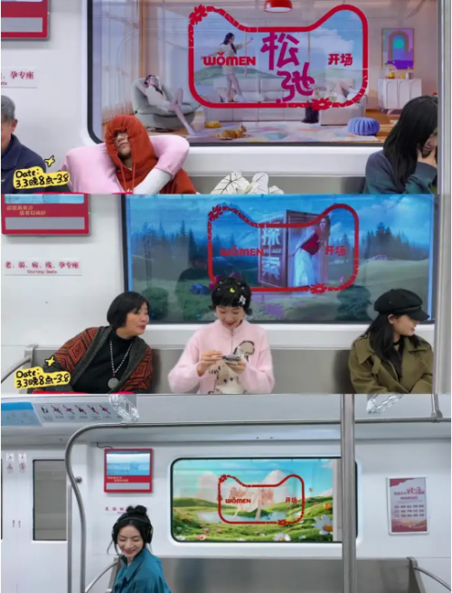 在长沙的地铁上,一幅猫头出现在车窗上,上面写着“wǒmen开场”。当列车进站的瞬间,车窗玻璃与站台海报的拼接让文字悄然“变身”——“wǒmen松弛开场”“wǒmen敢晒开场”“wǒmen探索开场”……这一充满巧思的动态填空题,拉开了天猫3.8节的序幕。这不仅是视觉的巧思,更是一场关于女性选择的宣言:人生没有标准答案,每一种开场都值得被书写。