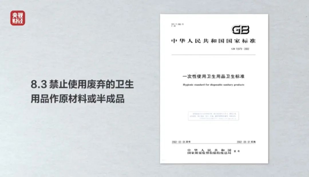 按照国标GB15979-2002《一次性使用卫生用品卫生标准》的明文规定,禁止使用废弃的卫生用品作原材料或半成品。而且卫生巾、纸尿裤等产品在原材料卫生、生产环境与过程卫生、消毒过程、包装运输与贮存等方面,国家质量法规都有着严格的要求。