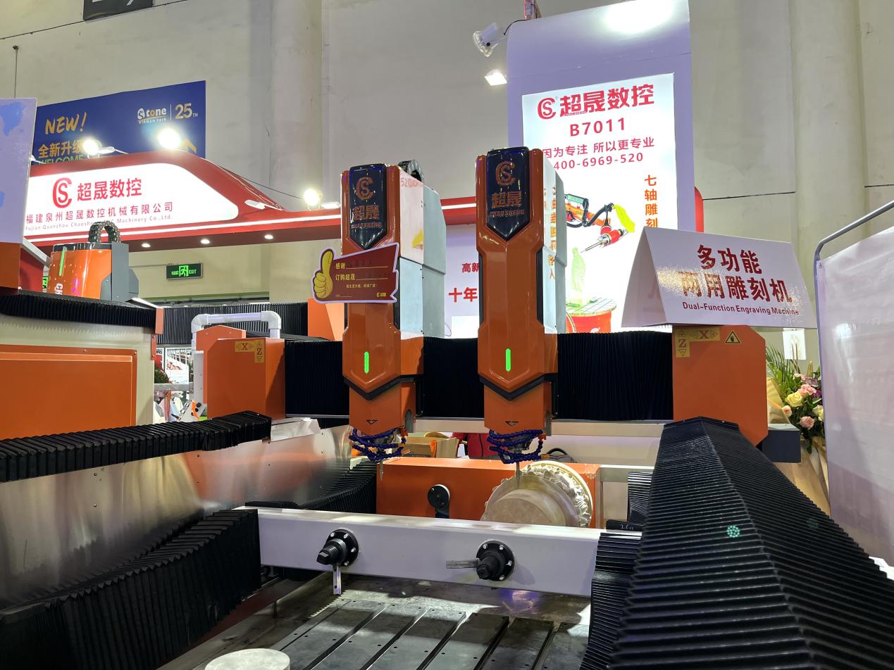 泉州装备协会理事单位——超晟数控展示了多功能两用雕刻机、五轴雕刻机、五轴桥切机等产品。其中,五轴桥切机搭载自研AI视觉系统,可自动识别石材纹理并生成最优切割路径,材料利用率提升至95%;多功能两用雕刻机则通过模块化设计实现切割与雕刻模式一键切换,满足个性化定制需求。