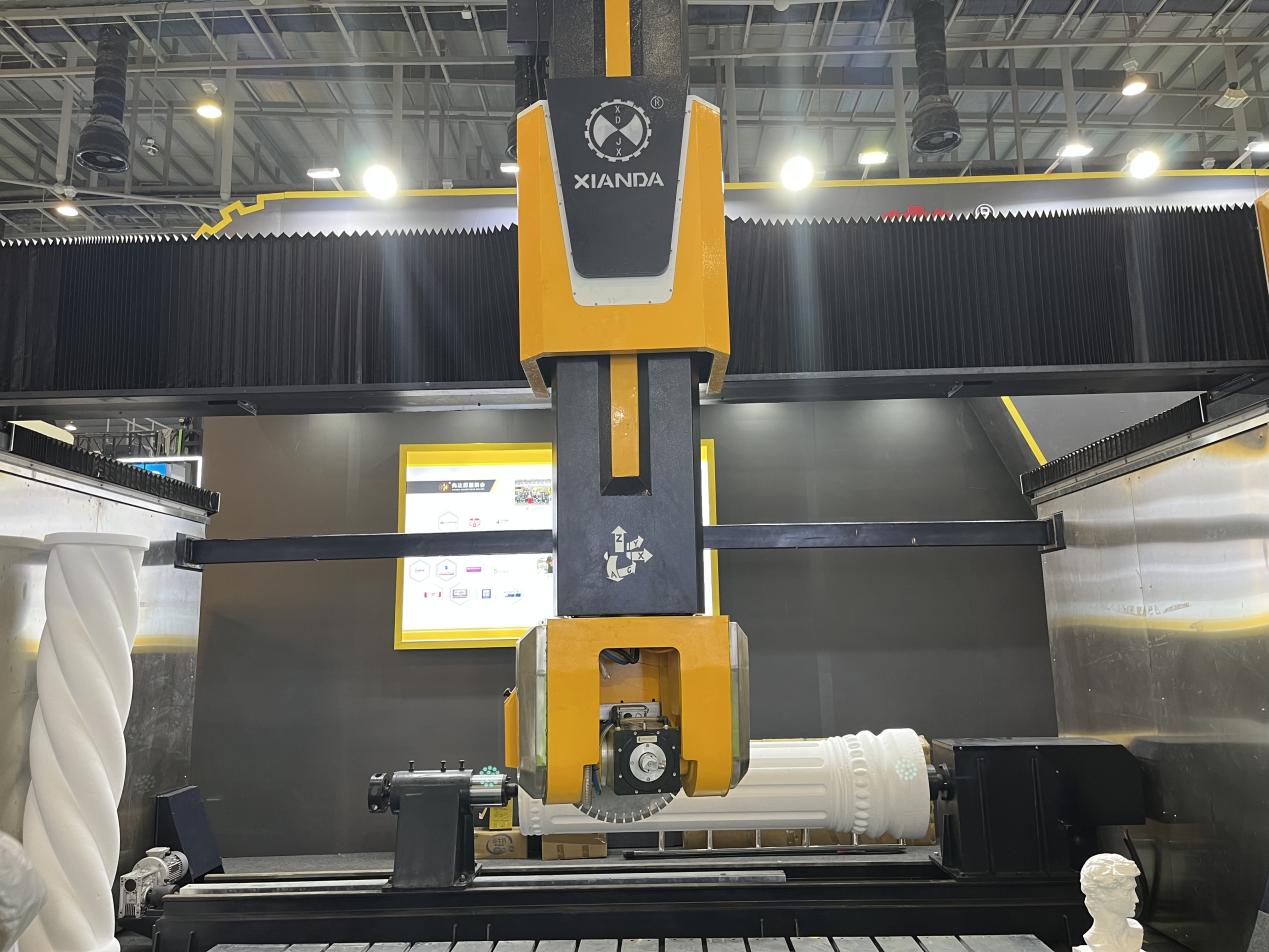 泉州装备协会执行会长单位——福建盛达机器股份公司展出TYR添锐数控五轴桥切机与金刚七号五轴桥切机。前者通过工业相机实现追纹排版与自动移板,大幅提升切割效率和加工精度,为石材加工带来全新的智能化体验;后者专为高难度异型加工而生,可定制切割各类复杂石材,助力企业降本增效。