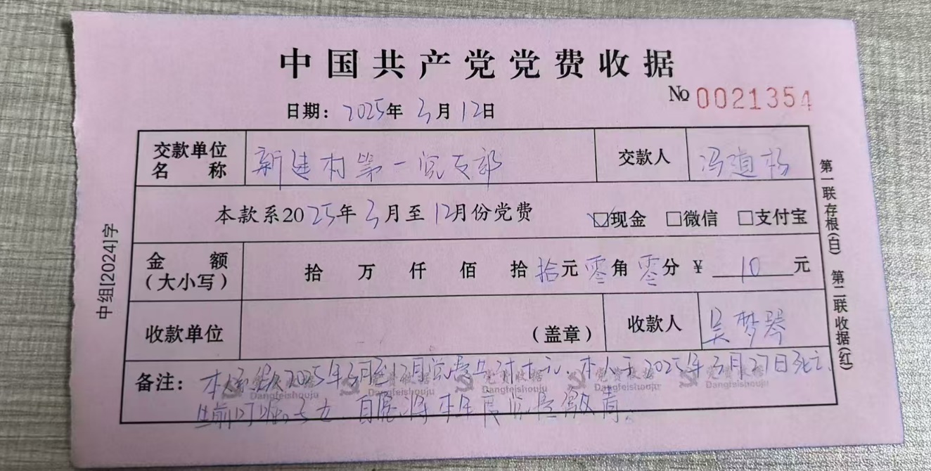“我每年应交党费12元,这是3月到12月的党费10元。”病榻上的冯道杨将最后一笔党费郑重交予儿子。彼时,他重病多日,已知自己时日无多,却仍紧攥着对党组织的庄严承诺。半个月后,这位老党员安然离世,用赤诚初心为83载人生画上句号。