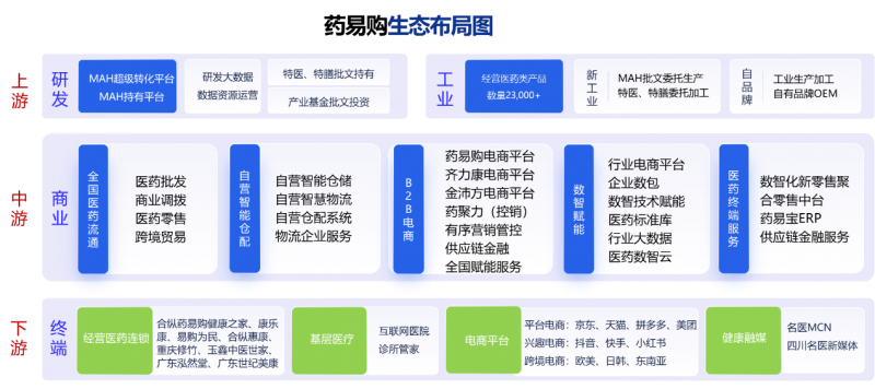 整体来看,药易购正以“医药+科技”“平台+生态”“自营+赋能”为核心定位,依托全渠道供应链与数智技术驱动,构建覆盖研发、生产、商业、零售、C端全渠道的SBbC生态体系,利用深耕院外市场的医药流通服务形成的流量入口,逐步向上下游拓展并搭建起了科技大健康生态平台,成为了科技大健康领域的产业链主导企业。