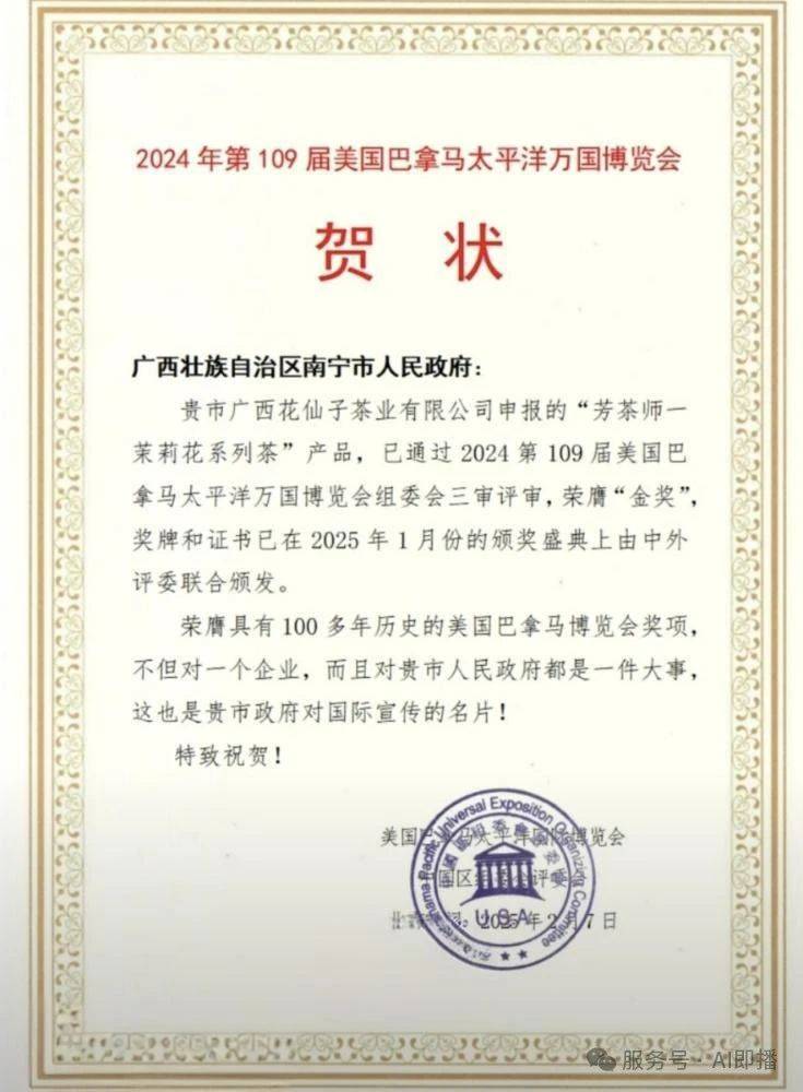 从航天功勋茶到巴拿马金奖,“芳茶师”完成了一次华丽的荣耀进阶。这不仅是广西花仙子茶业有限公司发展历程中的重要跨越,更是中国茶产业在国际舞台上的一次精彩亮相,为中国茶文化的国际传播与产业升级注入了全新活力。