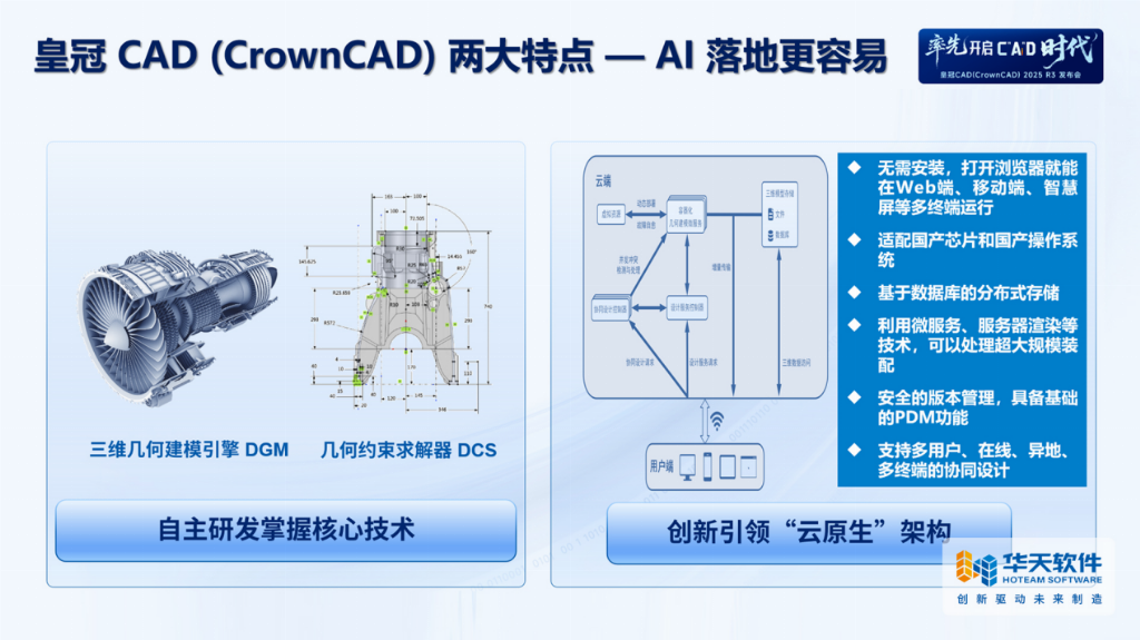 皇冠CAD2025R3版本的最大亮点在于AI技术与工业设计的深度融合。华天软件首席科学家梅敬成博士在发布会上指出:“皇冠CAD凭借完全自主的三维几何建模引擎(DGM)与几何约束求解器(DCS),叠加‘云原生’架构优势,率先攻克AI在三维CAD领域的落地难题,让AI落地更容易。”