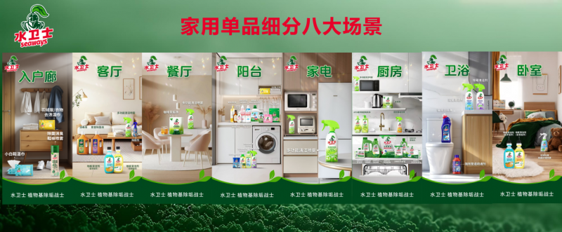 水卫士以“全屋无死角清洁”为目标,打造“八大场景×十大爆品”的植物基家族弹药库的产品矩阵,覆盖从入户到卧室的全空间需求:从入户廊到客厅、餐厅,从阳台到卫浴、卧室等,通过将十大爆品融合进八大场景中,消费者能直观地代入到自身在日常生活中的使用场景。从日常清洁到深度养护,水卫士以植物基技术为核心,实现“一瓶多用、场景全覆盖”,重新定义家庭清洁效率与健康标准。