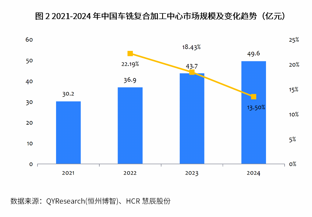 近年来,在金切机床整体市场规模增长乏力的背景下,车铣复合加工中心市场反而表现出较为稳健的增长趋势,高于金切机床行业的整体增速。长期来看,车铣复合加工方式将对传统机床应用进行整合替代,在半导体设备、医疗器械、航空航天等行业尤为明显。精密零部件加工需求增加,会推动中高端车铣复合机床需求的持续增长。QYResearch(恒州博智)统计数据显示,全球车铣复合加工中心市场规模从2021年的51.7亿美元增长到2024年的约66.5亿美元,中国市场约占全球市场的10%左右,据此HCR慧辰股份测算2024年中国车铣复合加工中心市场规模约49.6亿元。