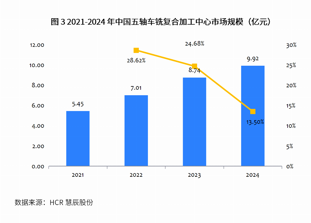 作为高端切削机床的代表,五轴车铣复合加工中心的市场规模近年来持续增长,但增速减缓。五轴车铣技术在军工、航空航天、船舶等领域具有广泛应用,尤其在航空航天领域形状复杂的异形零件的加工中更具优势。MIR睿工业发布的《2024年中国车铣复合机床市场研究报告》显示,中国五轴车铣复合加工中心市场规模约占中国车铣复合加工中心市场规模的20%左右,结合中国车铣复合加工中心市场规模,HCR慧辰股份测算2024年五轴车铣复合加工中心市场规模约9.92亿元。