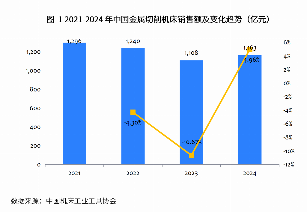 金属切削机床是先进制造技术的载体和装备工业的基本生产手段,是装备制造业的基础设备。随着中国金属切削机床产业升级,中国数控金属切削机床市场需求持续增长,尤其是中高端数控金属切削机床。中国机床工业工具协会统计数据显示,2024年中国金属切削机床销售额为1,163亿元,同比增长4.96%。
