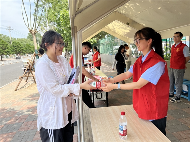 在天津市宝坻一中高考考点,中建六局第七建设宝坻工厂志愿服务队开展暖心助考志愿服务活动。活动现场,志愿者们精心搭建爱心服务站,为考生及家长提供矿泉水、纸巾、湿巾、扇子等物资,并设置休息区域。同时,积极协助维持考场周边秩序,引导家长有序等候,以贴心服务为考生保驾护航,助力考生以最佳状态逐梦考场。