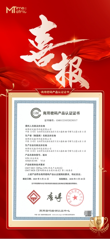 近日,南京未来产业天使基金首投企业——矩阵时光数字科技有限公司(以下简称“矩阵时光”)实现重大技术突破,其自主研发的矩阵时光VPN安全网关ADQS-8210SV3.0正式通过国家密码管理局商用密码检测中心认证,荣获商用密码产品认证证书。这一里程碑式的成绩不仅彰显了企业在信息安全领域的技术实力,也印证了未来产业天使基金在前沿科技领域投资布局的前瞻性。