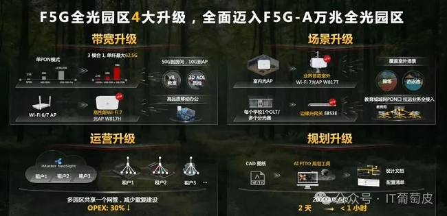F5G-A是FifthGenerationFixedNetworkAdvanced的缩写,代表了第五代光网络的全新进化。相对于之前的F5G标准,华为F5G-A万兆全光园区网络解决方案实现了四大升级: